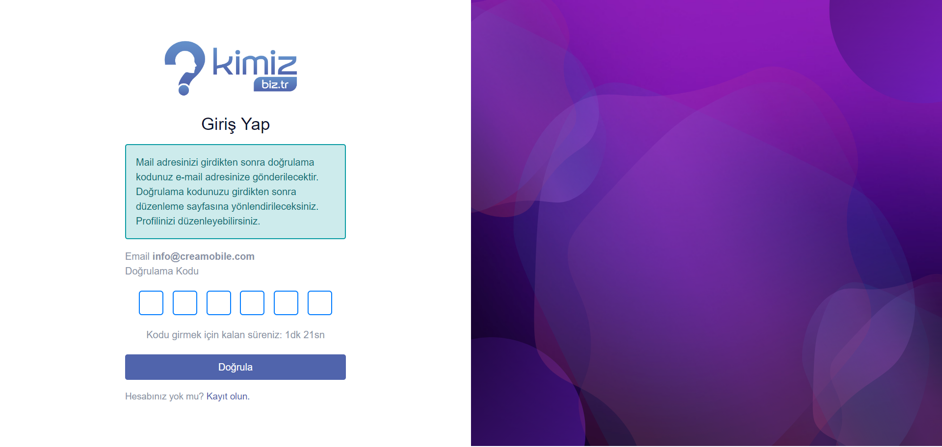 <figure><img src="https://2399439764-files.gitbook.io/~/files/v0/b/gitbook-x-prod.appspot.com/o/spaces%2Fw9JFxRcjcDclkJ73SwWN%2Fuploads%2FdvMtZ7uszXbKHDUfLWiH%2Fscreencapture-kimiz-biz-tr-user-Login-2024-07-17-11_03_16.png?alt=media&#x26;token=4270ecd8-a65a-49be-ac4e-71fa4ec1d1d0" alt=""><figcaption><p>Kod Doğrulama Sayfası</p></figcaption></figure>