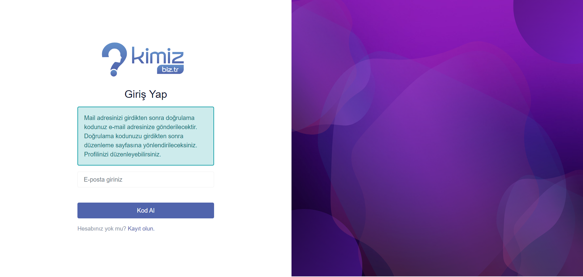 <figure><img src="https://2399439764-files.gitbook.io/~/files/v0/b/gitbook-x-prod.appspot.com/o/spaces%2Fw9JFxRcjcDclkJ73SwWN%2Fuploads%2FoYb7rRIeRKFzex6gKepC%2Fscreencapture-kimiz-biz-tr-user-login-2024-07-17-09_23_38.png?alt=media&#x26;token=9813c58c-6e15-4905-8fe5-7a4300690802" alt=""><figcaption><p>Giriş Yapma Sayfası</p></figcaption></figure>